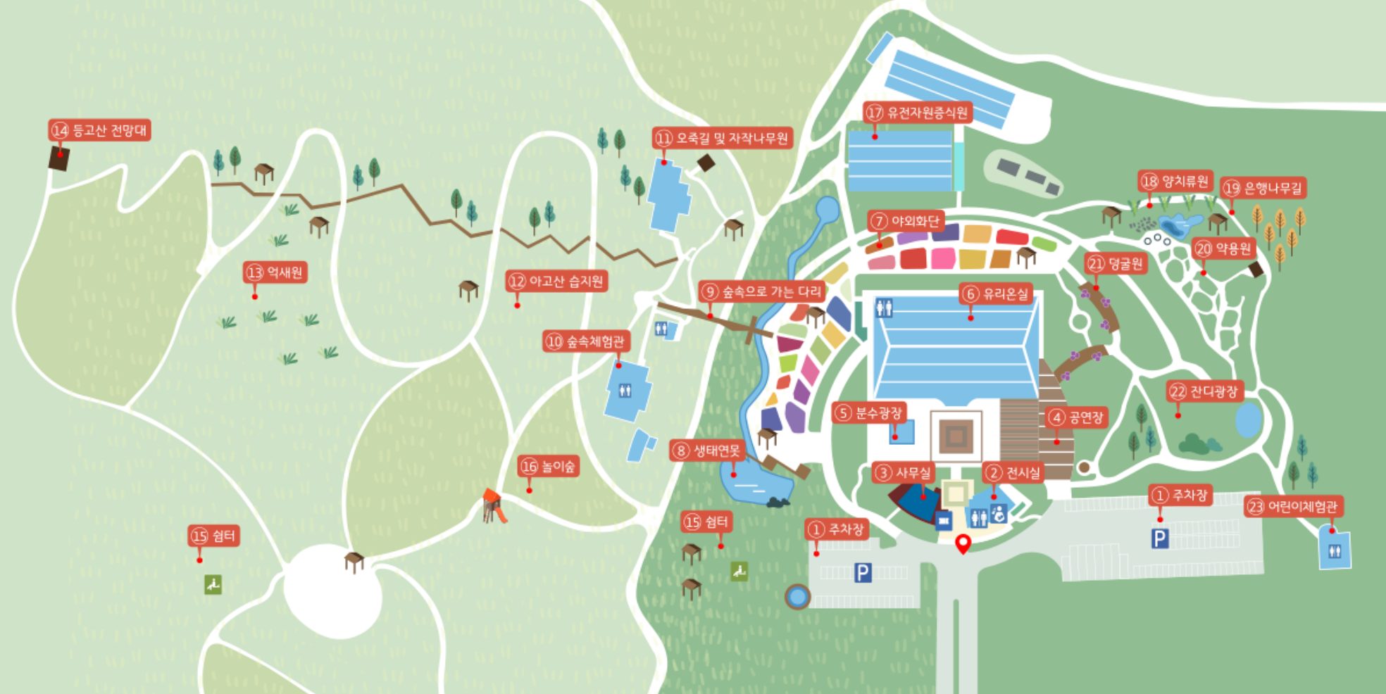 • 열린 숲, 호수원, 주제원, 습지원 등 4개 테마 공간 구성