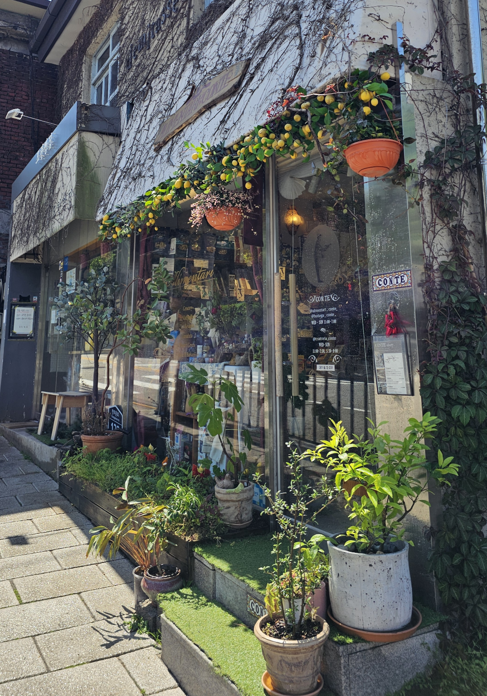 알리멘따리 꼰떼는 부암동의 경사진 골목길에 위치한, 외관부터 이탈리아 소도시의 상점을 연상시키는 매력적인 공간입니다. 가게 앞에 다양한 허브가 자라는 화단 및 토분, 필기체가 어우러진 노란 나무 간판과 차양 아래 레몬 덩굴이 특징입니다.