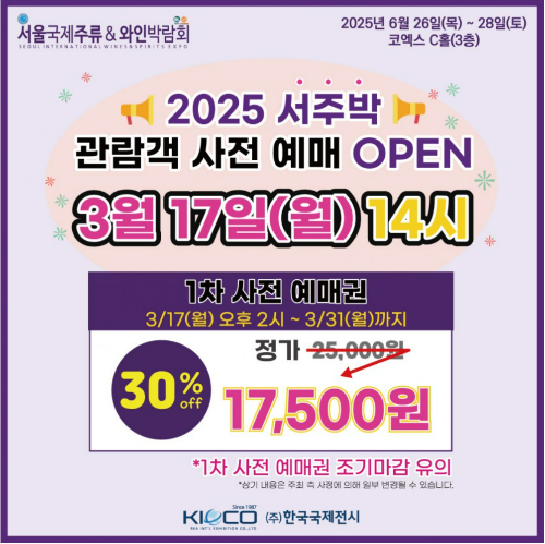 2025년 3월부터 12월까지 주류 박람회 일정입니다. 각 박람회는 공식 홈페이지나 SNS 채널을 통해 최신 정보를 확인할 수 있으며, 얼리버드 티켓 사전 예매 시 할인 혜택과 함께 입장 대기 시간을 줄일 수 있습니다.