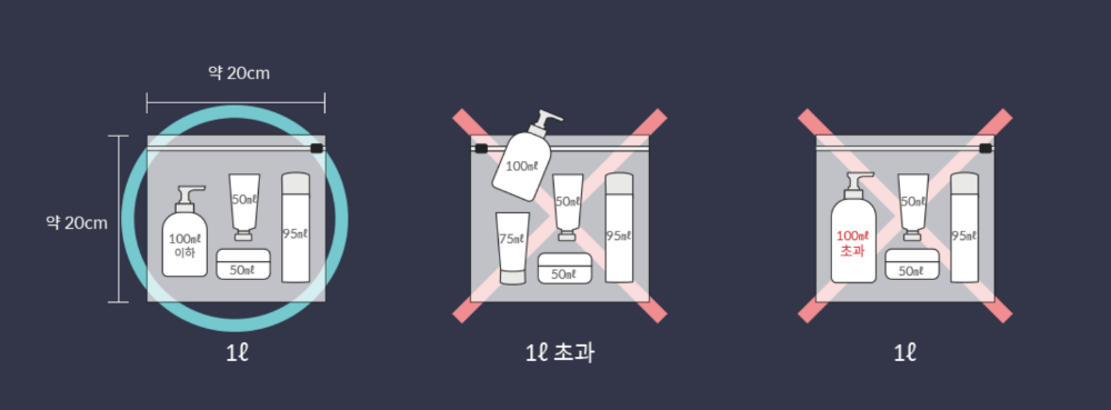 - 총 용량 제한: 약 20cm×20cm 내외 크기의 1L 이하 투명 지퍼백 1개에 모든 액체류를 담아야 합니다.