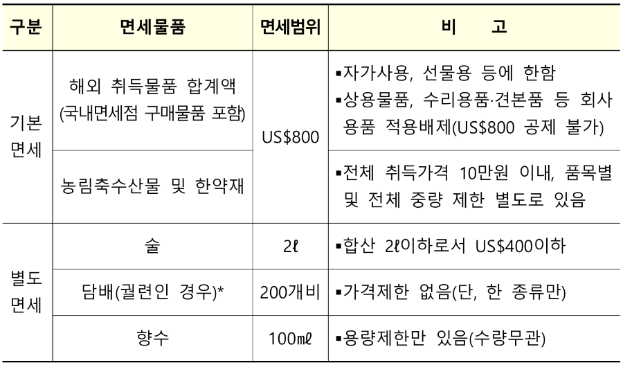 • 사업·상업용, 견본품, 수리용품 등 회사용 물품은 기본 한도에서 제외됩니다.