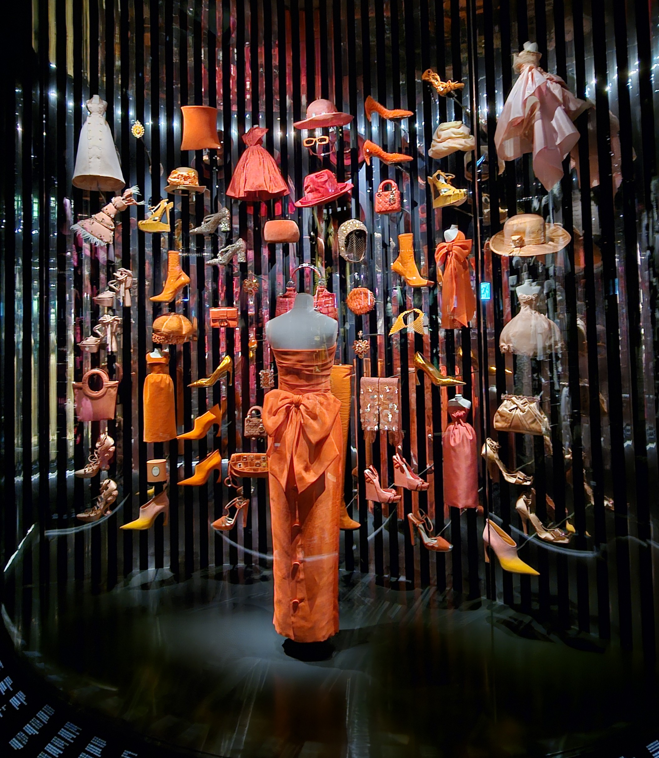 - 디올이 선보인 다양한 컬러의 드레스와 액세서리, 뷰티 아이템을 한눈에 감상할 수 있는 공간.