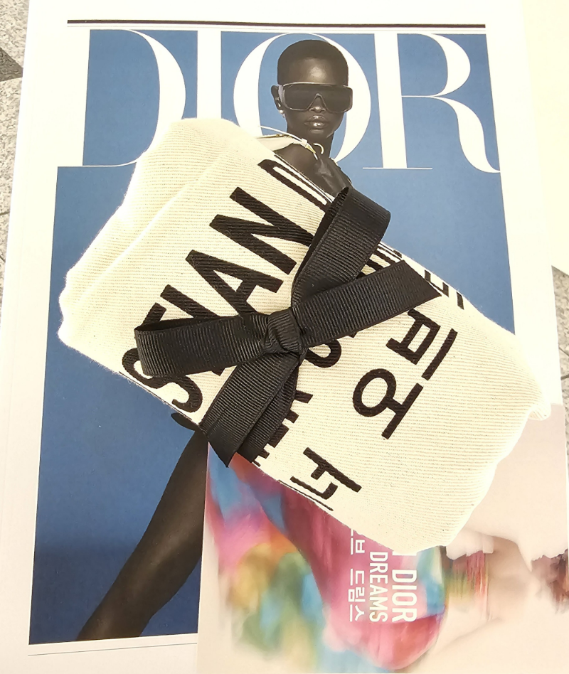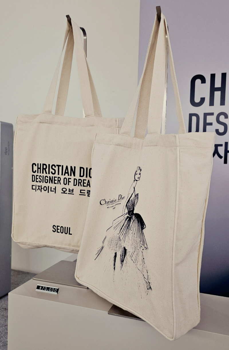 요즘 한소희, 김연아, 남주혁 등 인기 스타들이 직접 착용하며 화제를 모으고 있는 디올 에코백은, 전시 굿즈 한정판으로 가격은 70,000원입니다.